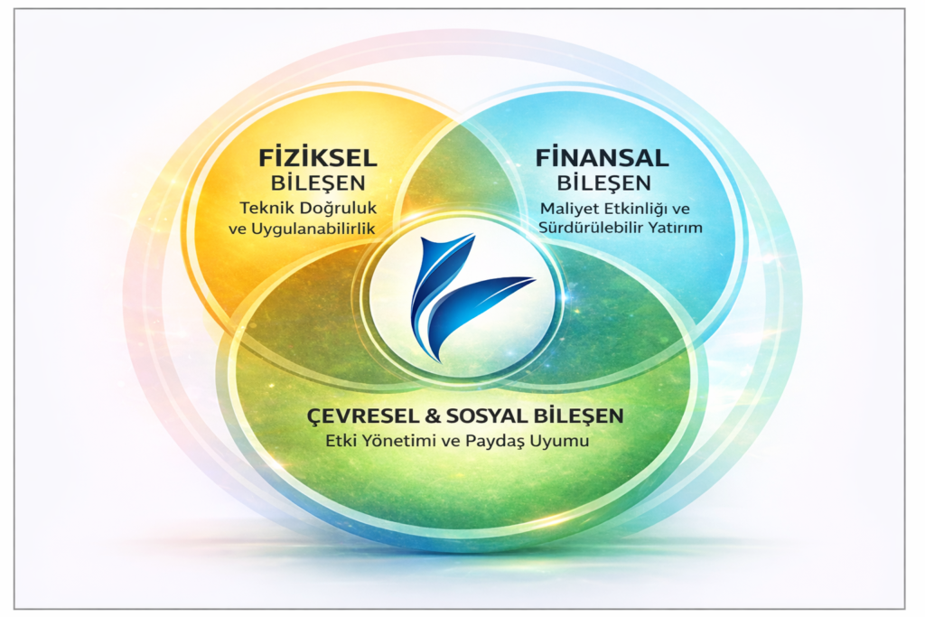 Fiziksel bileşen kapsamında mühendislik çözümlerinin teknik doğruluğu ve sahadaki uygulanabilirliği esas alınırken; finansal bileşende maliyet etkinliği, yatırımın geri dönüşü ve kaynakların verimli kullanımı dikkate alınır. Çevresel ve sosyal bileşen kapsamında ise projelerin çevreye etkileri, toplumsal uyum, paydaş katılımı ve sürdürülebilirlik gereklilikleri değerlendirilir.